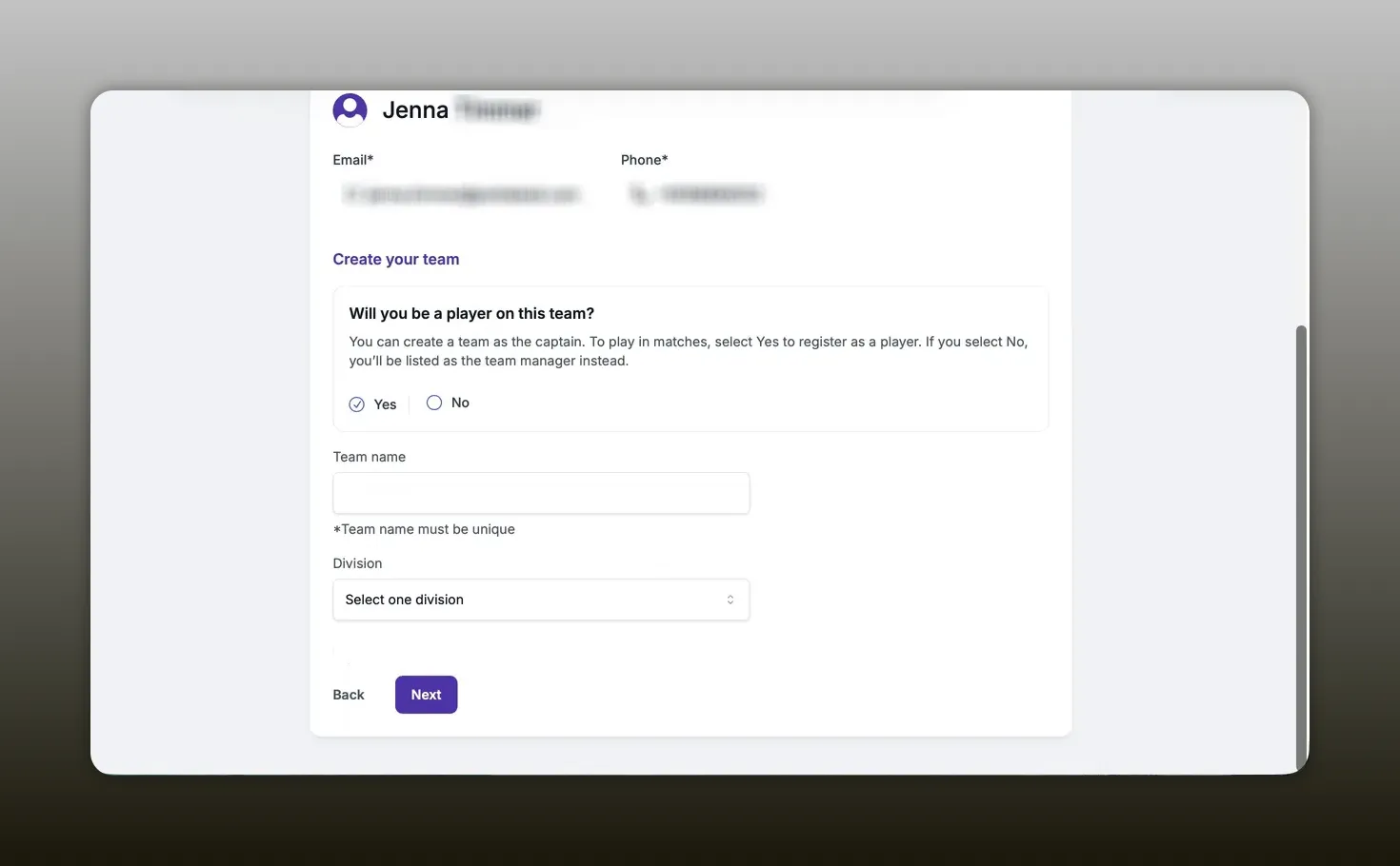 - - Select Team Registration as the captain and fill out required information such as team name and division.