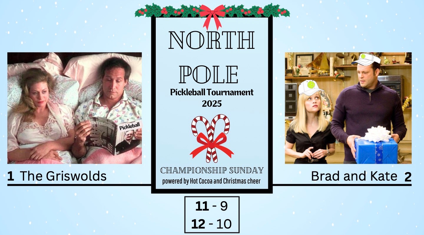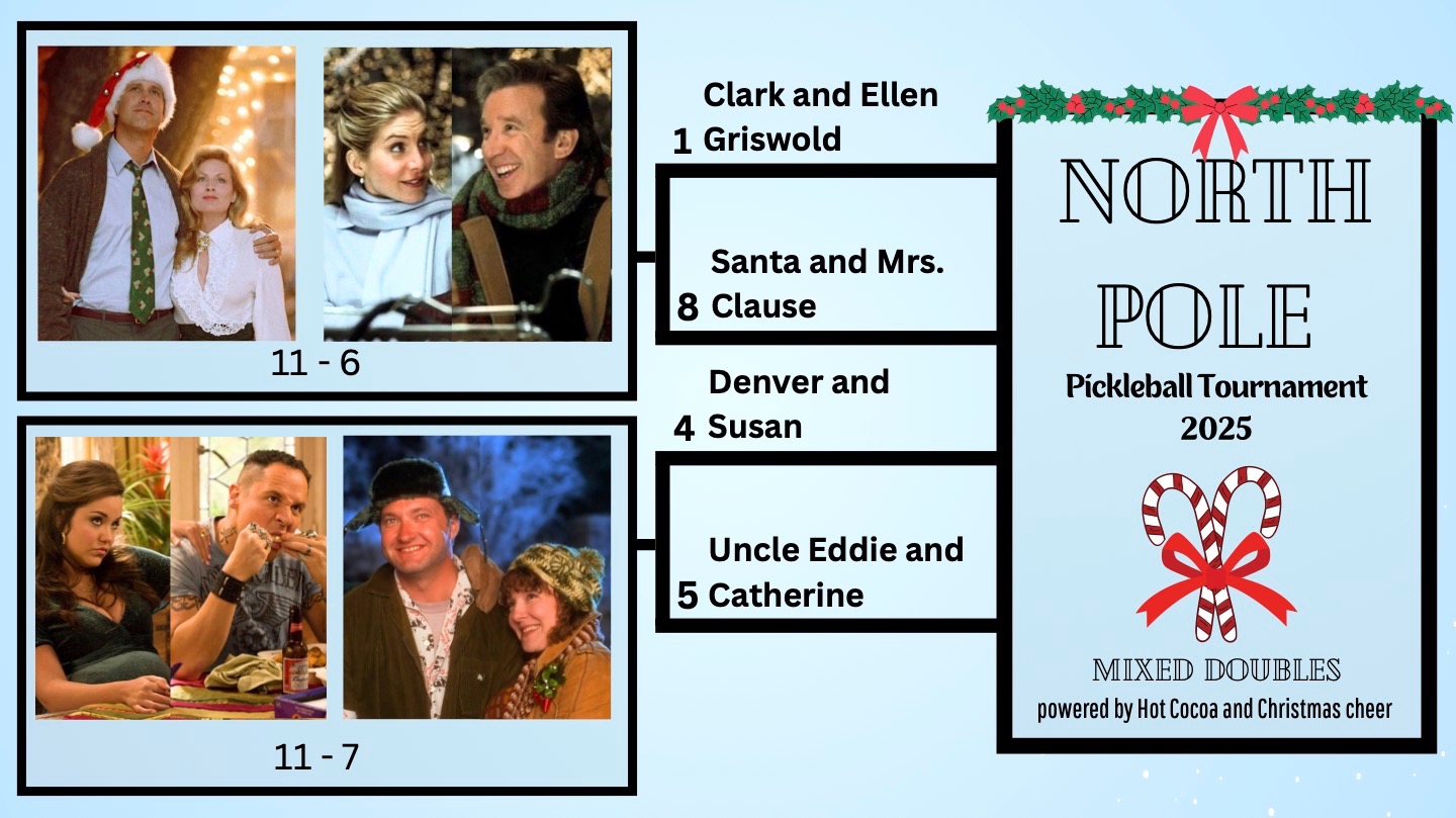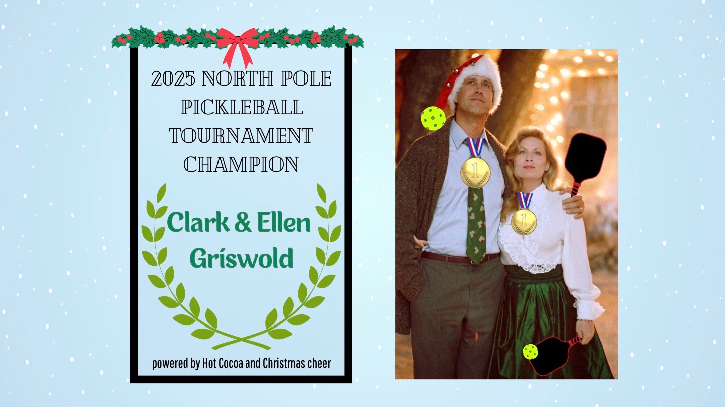 As part of their victory, Clark and Ellen Griswold won an all-expenses-paid vacation to the pickleball getaway of their choice (sorry, Wallyworld is excluded) and a lifetime supply of pickle jelly, which Uncle Eddie happily accepted on Clark’s behalf. Congratulations to the North Pole’s newest pickleball champions!