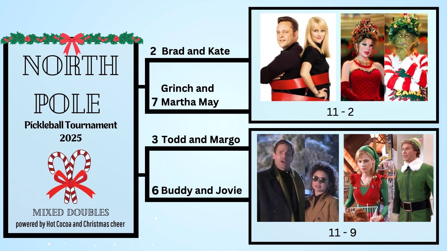 On the other side of the bracket, Brad and Kate cruised to an easy win over the Grinch and Martha May. Martha May’s outrageous court fashion kept getting in the way, and honestly, the Grinch and Martha seemed like two lovestruck Whos, too distracted by each other to focus on the game.