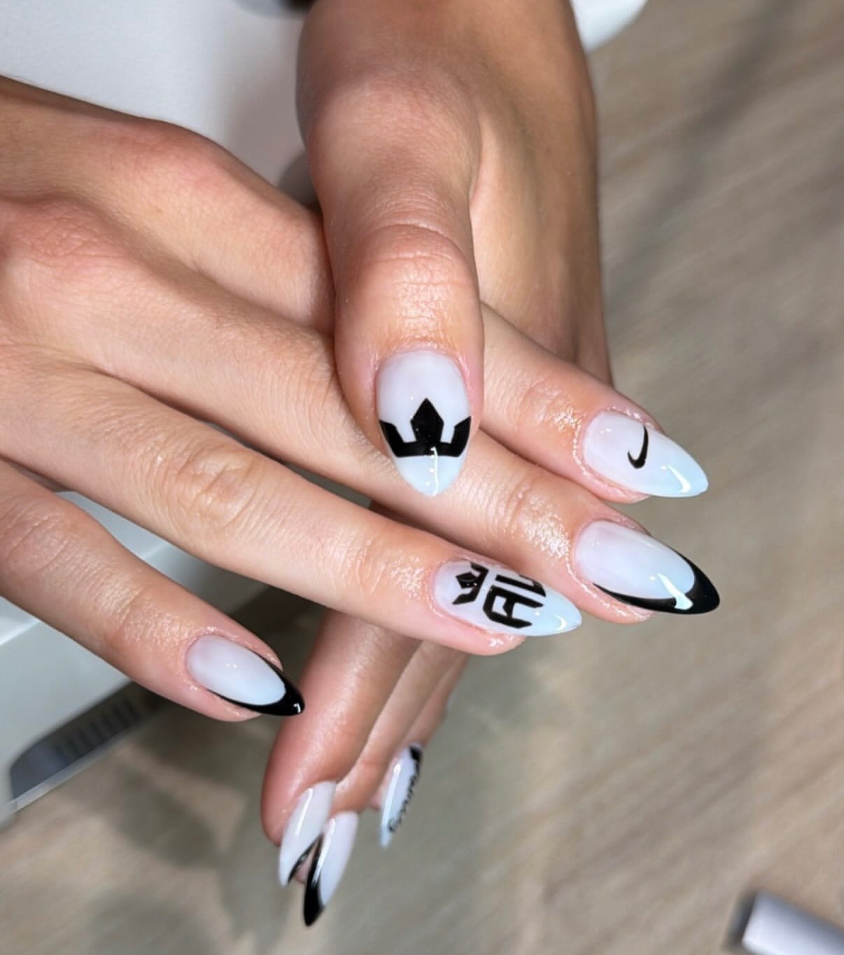 Waters debuted white nails with black French tips, elevated by custom details that reflect her achievements on the court. Her pointer finger features a Nike swoosh to mark her status as a Nike athlete, while her ring finger showcases the ALW logo.