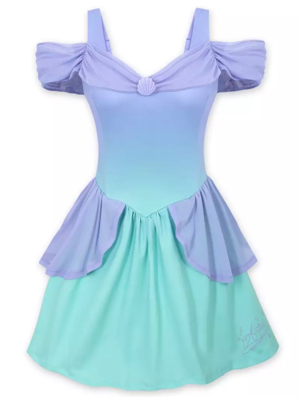 I love the ombre purple to seafoam green color pallet. The little shell detailing is so cute and a perfect reference to her life before she got her legs. The fluttery silhouette feels like a classic Disney princess, but makes it modern. And it’s the most unique in the lineup when it comes to the silhouette.