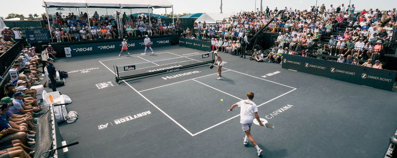 A mixed doubles pro pickleball match .